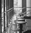 L'extension, en encorbellement sur la rue, est un espace vitré et métallique, compartimenté en carrés et abritant une rangée de tables en contrebas de la salle. En façade, deux colonnes lumineuses associent le rez-de-chaussée et le premier étage, au plafond souligné d'une ligne de néon rose.